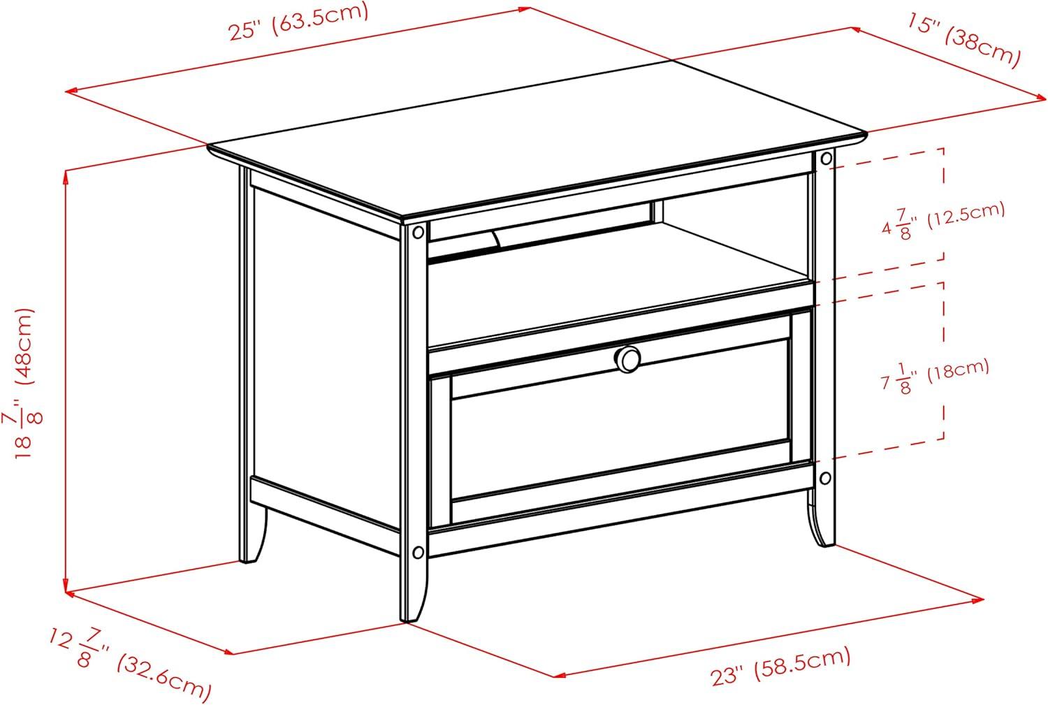 Beyond the surface, the storage options enhance its practicality without compromising design. Featuring an open shelf and a pull-down door compartment, it accommodates media devices and accessories while keeping clutter out of sight. Built primarily from solid and composite wood materials with an elegant espresso finish, it delivers sturdy durability matched with rich warmth. Below, we’ve highlighted key dimensions that make this piece both versatile and visually appealing: