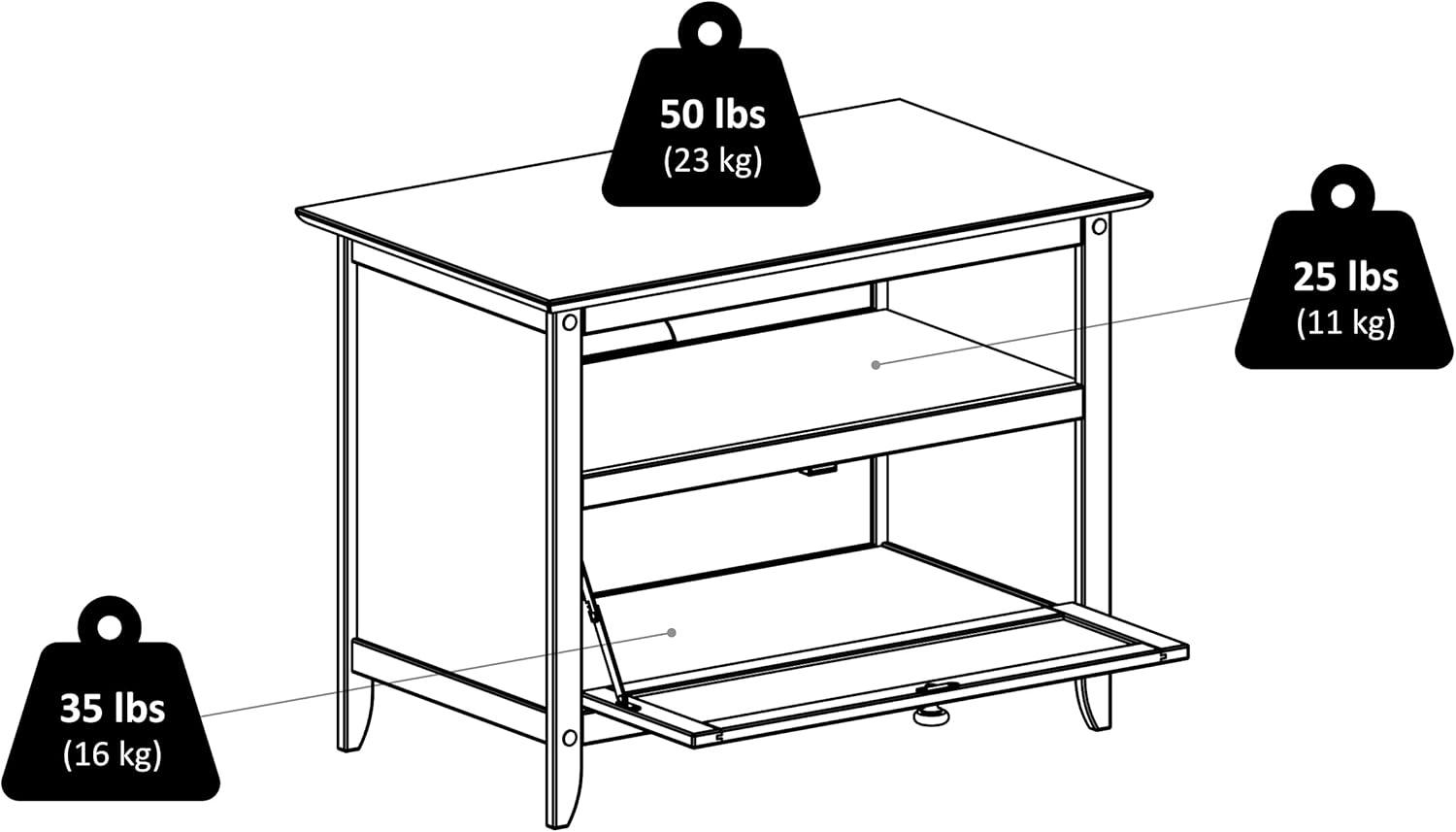 | Solid/composite wood construction feels sturdy yet stylish | Weight capacity maxes out at 50 lbs, so heavier AV equipment may not be suitable |