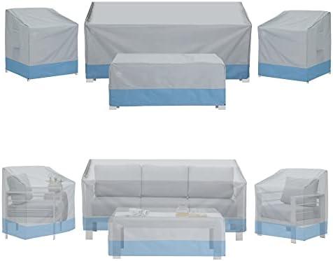 Featuring high-grade materials, this 4-piece set of outdoor furniture covers provides superior protection against the elements. Crafted from heavy-duty 600D oxford fabric with a thick PVC undercoating, these covers are 100% waterproof, as well as resistant to UV rays, wind, and snow. With precise measurements for each item, including armchair and sofa covers alongside a coffee table cover, they ensure a snug fit. The detailed design includes an elastic hem cord with an adjustable toggle and four buckle straps that keep the covers securely in place, even during windy days. Additionally, padded handles offer convenience for easy removal, while integrated air vents help prevent condensation build-up.