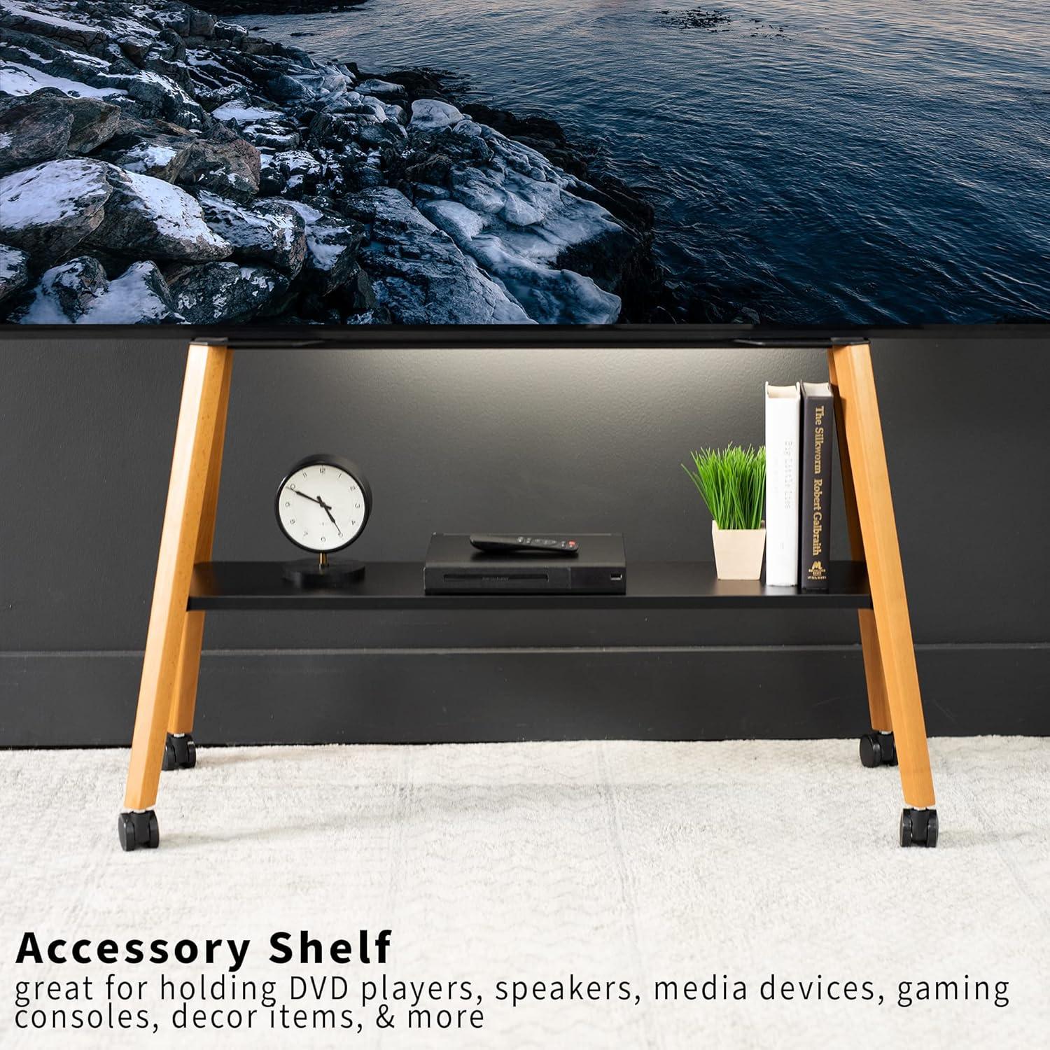 From the moment we assembled this mobile studio TV display stand, it was clear that the design married style and functionality effortlessly. The solid walnut legs give it a warm, artistic look that elevates any living space, while the sleek black frame offers a modern contrast. Assembly was straightforward thanks to clear instructions, and once complete, the easel proved to be remarkably sturdy-comfortably supporting our 55-inch TV without any wobble. The adjustable mount fits a wide range of VESA patterns, making it versatile for various screen sizes between 43 and 75 inches. The included accessory shelf is perfectly sized for media devices and gaming consoles, keeping everything neatly organized and within easy reach.