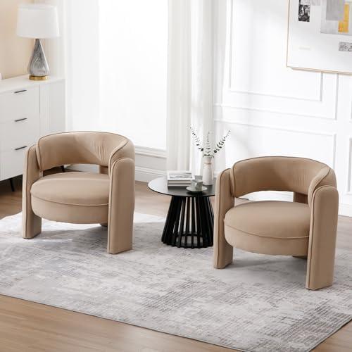 Transforming your living space has never been easier with this delightful set of accent chairs, featuring a modern barrel design and a soft khaki velvet upholstery. These chairs not only add a touch of elegance and charm to any room but also offer exceptional comfort, thanks to their high-density foam filling. The sturdy solid wood base ensures stable support, and the non-slip foot pads protect your floors from scratches, making them a practical choice for any home.