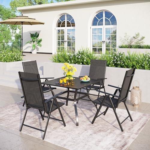 Dine comfortably outdoors with this 5-piece dining set, crafted from durable powder-coated aluminum alloy and metal steel. The square table features a stylish mesh-style top, while the four folding chairs boast breathable sling fabric for ultimate comfort. Each chair can be adjusted to seven different reclining positions, making it easy to find the perfect angle that suits your relaxation needs. The lightweight construction and compact folding design also make for easy storage, ensuring this set adapts well to any outdoor setting.