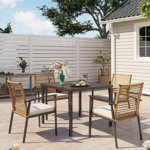 This outdoor dining set features a beautifully crafted design with high-quality PE wicker and a sturdy steel frame, ensuring durability and resistance to various weather conditions. The chairs come with plush, removable cushions made of thick sponge, providing a comfortable seating experience. The spacious square table includes a 1.5″ umbrella hole, perfect for adding shade, and its oversized 36.6″ surface offers ample space for meals and drinks. Furthermore, adjustable feet make it suitable for uneven ground, enhancing stability and usability in diverse outdoor settings.