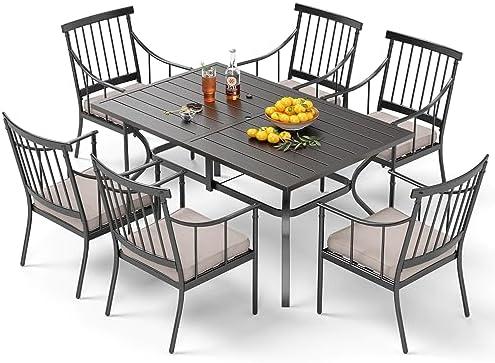 However, while the set boasts many positive attributes, there are some potential downsides. The lightweight nature of the construction may raise concerns about stability in extremely windy conditions, and the all-black design may not appeal to those who prefer brighter colors. Additionally, the cushioning, while comfortable, might require occasional maintenance to keep looking fresh. Despite these minor drawbacks, this outdoor dining set remains a robust choice for enhancing your outdoor living area.