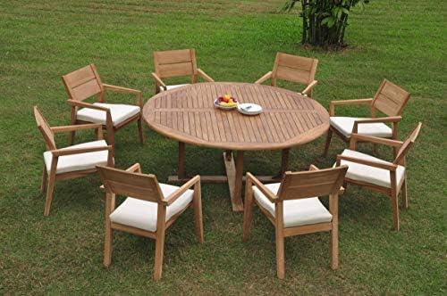 This remarkable dining set features a spacious 72″ round table accompanied by eight stylish stacking armchairs, all crafted from premium solid teak wood. The table design includes a convenient 2″ umbrella hole, allowing you to add shade on sunny days (umbrella sold separately). The quality construction utilizes glued mortise and tenon joints for superior strength and durability. The armchairs arrive fully assembled, making it easy to stack them for efficient storage when not in use. The rich, natural finish of the teak wood not only enhances aesthetic appeal but also ensures longevity, making this set an excellent investment for your dining area.