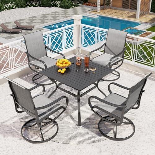 Designed with both aesthetics and durability in mind, this outdoor dining set provides a comfortable and stylish solution for your patio, poolside, or garden. The set features a square metal dining table that measures 37 inches on each side and is paired with four swivel dining chairs, offering an inviting space for dining with family or friends. The chairs are constructed from premium Textilene fabric, ensuring breathability and comfort, while also being easy to clean and maintain. An anti-rust coating on the metal frame further enhances durability, ensuring the set remains attractive and functional in various weather conditions.