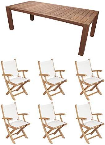 This outdoor dining set features a spacious 96-inch rectangular table crafted from premium teak, known for its high oil content that provides natural resistance against the elements. The durable construction is enhanced with kiln-dried wood and robust mortise and tenon joints, ensuring longevity and stability. Designed with a clean and elegant aesthetic, this set also provides a 2-inch umbrella hole that accommodates most standard patio umbrellas, making it ideal for outdoor gatherings. Complementing the table are six folding Sailmate armchairs, which are not only constructed from the same high-quality teak but also feature comfortable sling seats that enhance your dining experience.