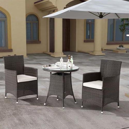 Experience the perfect blend of style and functionality with this modern outdoor dining set. Featuring a round table with a tempered glass top, and two comfortable wicker chairs, it’s designed for both relaxation and dining. The removable and washable cushion covers ensure an easy maintenance experience, allowing you to enjoy meals and gatherings in comfort. Built from weather-resistant materials, the sturdy metal frame and resilient wicker are crafted to withstand the elements, making this set a fantastic choice for year-round outdoor use.