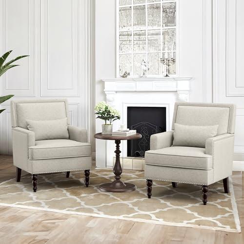 The stylish armchairs provide a blend of modern aesthetics and classic charm, making them a delightful addition to any living space. Featuring vintage-inspired wooden legs and a meticulous nailhead decoration, these chairs create an inviting atmosphere while ensuring durability and comfort. Upholstered in linen fabric, they are designed to resist stains and maintain their fresh appearance, while the high elastic spring seat cushions offer exceptional support for extended sitting periods. The T-shaped cushion design provides ample thigh space, and the lumbar support makes them perfect for leisurely reading or socializing.