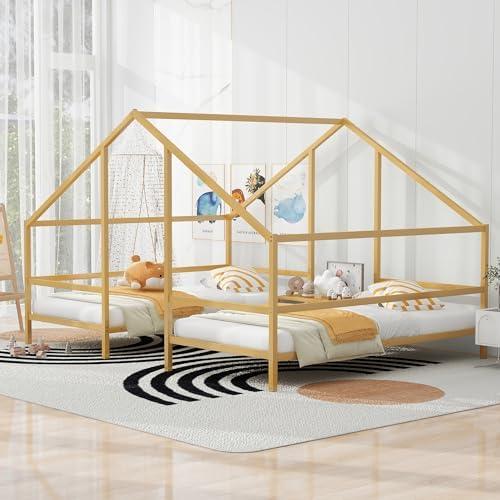 Metal Double Twin Size Triangular House Beds, House Bed with Built-in Table, Gold