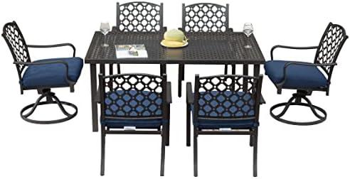 This patio dining set is designed to elevate your outdoor dining experience with its modern and elegant aesthetic. The combination of a stable iron structure and an antique bronze finish makes it not only durable but also visually appealing. The set includes two swivel chairs and four dining chairs, providing ample seating for up to six people. Each chair features a ventilated backrest and a thick cushion covered in high-quality fabric, ensuring comfort during leisurely meals. The dining table is equipped with a hole for an umbrella, making it suitable for various weather conditions while preventing rain accumulation.