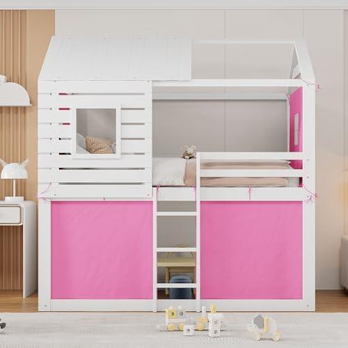 Full-Size House Bunk Bed with Tent and Roof for Kids