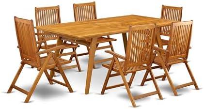 This outdoor dining arrangement features a beautifully designed rectangular table and six folding arm chairs, all crafted from high-quality acacia wood with a stunning natural oil finish. The spacious table, measuring 40×72 inches, provides ample space for meals and gatherings, making it an excellent addition to any patio or garden. The folding chairs are not just practical; they offer adjustable comfort with a tall slatted back, catering to various seating preferences. With a maximum weight capacity of 300 lbs for the table, the set is both sturdy and functional.