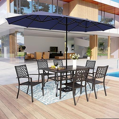Pros for this outdoor dining ensemble include its robust construction that promises longevity, stylish aesthetics that blend rustic charm with modern design, and the comfort afforded by high-density sponge cushions. However, some considerations involve the necessity to buy an additional umbrella base, as it is not included, and the requirement to keep the cushions dry to extend their lifespan. Comfortably accommodating six people, this outdoor dining set is an excellent choice for backyards, patios, and poolside gatherings.