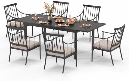 This stylish outdoor dining set combines functionality and elegance, making it an excellent addition to any patio, deck, or yard. The expandable rectangular table can effortlessly increase in size from 61″ to 84″, allowing you to accommodate 6 to 8 people for your family gatherings or friendly barbecues. Its construction of high-density wrought iron ensures durability and stability on various terrains, while the unique e-coating process provides a robust rust-resistant barrier. The accompanying cushioned steel chairs, featuring 3.5″ thick foam cushions, offer unmatched comfort, making it easy to sit for hours during those delightful outdoor meals.