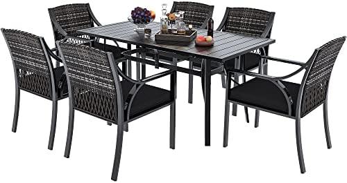 This outdoor dining set features durable handwoven wicker that combines aesthetic appeal with strength, making it a great choice for various outdoor settings such as lawns, gardens, or decks. Designed to comfortably seat six people, it includes a spacious dining table equipped with an umbrella hole to provide essential shade during sunny days. Each chair in the set comes with thick, removable cushions that boast water-resistant and machine-washable covers, enhancing both comfort and convenience for maintenance. Assembly is straightforward, requiring only the included hardware and instructions.