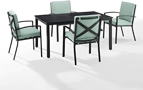 This stylish and modern outdoor dining set features a large rectangular table accompanied by four comfortable chairs, making it a perfect choice for hosting family gatherings or casual meals al fresco. The substantial table, measuring 98.5 x 121.5 x 37 inches, is designed with a slatted surface that not only enhances its aesthetic appeal but also provides plenty of space for serving delicious dishes. The oiled bronze finish gives the set a sophisticated look, while the mist-colored cushions add a touch of comfort and elegance that seamlessly blends with various outdoor themes.