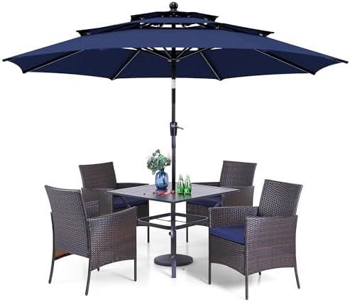 One of the standout features is the impressive 10ft patio umbrella, designed with a 3-tier polyester canopy supported by 8 rust-proof steel ribs, ensuring stability even in moderate winds. The autotilt mechanism allows users to effortlessly adjust the umbrella’s angle for optimal sun protection. However, it’s important to note that the umbrella base is not included, which could be a drawback for some buyers. the easy assembly process and stylish design make this set a great addition to any outdoor space.