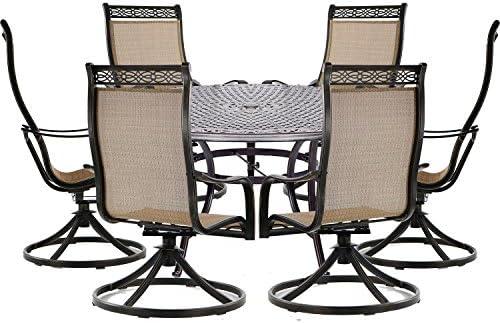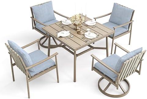 The ergonomic design of this patio dining set ensures long-lasting durability while providing a soft touch with breathable outdoor fabric that dries quickly and resists fading. The easy-clean sling seats conform to your back’s natural curves, offering long-lasting comfort for any weather condition. While the set’s quality construction promises an enduring addition to your patio, potential downsides include the need for periodic maintenance to keep it in pristine condition and the overall space it occupies on your deck or patio. Nonetheless, this dining set is an ideal choice for outdoor gatherings and family meals.
