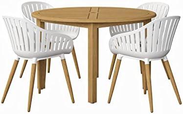 Transform your outdoor space with a sophisticated dining set designed for both comfort and style. This collection includes a round table and four contemporary chairs, all made from 100% FSC-certified eucalyptus wood, ensuring sustainable sourcing. The teak finish provides an elegant touch, making it an excellent addition for outdoor gatherings. Each chair supports a weight capacity of up to 250 lbs, offering both durability and functionality. The lightweight structure of the chairs makes them easy to rearrange, while the sturdy construction ensures they can withstand various weather conditions throughout the year.