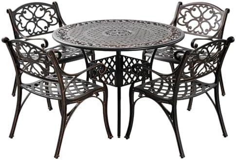 However, despite these advantages, there are a few considerations to keep in mind. Its lightweight design may not withstand heavy winds unless properly secured. Although assembly is straightforward with provided instructions, it is recommended to have two people for efficiency. Regular maintenance is minimal, requiring just a quick wipe-down to maintain its appearance, but the classic bronze color may show wear over time in heavily used areas. Ultimately, this set offers a charming option for outdoor dining while balancing comfort and durability.