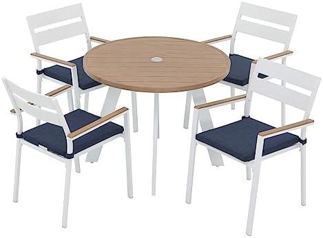 This outdoor dining ensemble is designed for functionality and aesthetic appeal, featuring four stackable chairs and a round table with an attractive wood grain finish. The durable aluminum frame not only promises longevity—being dust-proof and rust-resistant—but also ensures safety for various weather conditions. One of the standout features is the 2.05-inch umbrella hole situated at the center of the table, allowing you to easily add shade for those sunny days while enjoying meals outdoors. The set’s modern navy blue cushions accentuate the overall design, adding a touch of elegance to your patio or backyard.