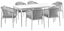 This exquisite 7-piece dining ensemble is designed to elevate your outdoor space, combining modern aesthetics with durability. Constructed from robust aluminum, each dining chair features chic light gray rope detailing and plush, removable cushions made from solution-dyed acrylic fabric. The luxurious sintered stone tabletop of the dining table not only adds elegance but is also resistant to weather conditions, ensuring both style and longevity. Its generous seating can comfortably accommodate up to six people, making it an ideal choice for casual family meals or festive gatherings. Additionally, the set’s low maintenance requirements allow you more time to enjoy outdoor dining rather than worrying about upkeep.