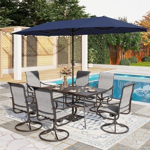This versatile outdoor dining ensemble is designed to elevate your patio experience, featuring six comfortable swivel chairs and a spacious metal dining table with a sizeable umbrella hole. The chairs are equipped with high-density textilene fabric, ensuring breathability and easy maintenance, making them perfect for any weather condition. The large dining table, coated to resist rust and water, provides ample space for entertaining family and friends. The 13-foot navy blue umbrella not only adds a splash of color but also offers generous shade, perfect for keeping cool during sunny days.