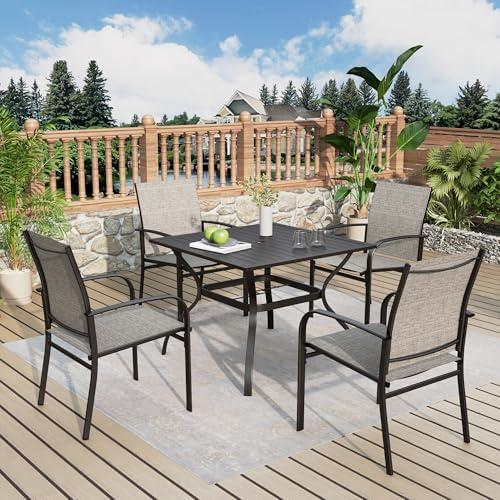The patio dining set combines elegant design with practical comfort, offering a perfect outdoor solution for family gatherings or BBQs. Featuring a square metal dining table with a rust-resistant coating and four padded swivel chairs, it’s ideal for your porch, garden, or backyard. The 10-foot umbrella provides ample shade with its durable aluminum structure and auto-tilt feature, ensuring you stay protected from harsh UV rays during sunny days. Each chair is constructed with upgraded Textilene fabric and quick-drying foam, allowing for breathability and comfort.