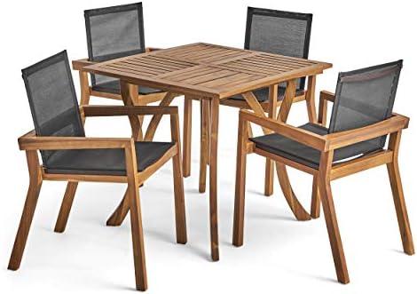 GDFStudio Outdoor Acacia Wood 4 Seater Square Dining Set with Mesh Seats, Teak and Black