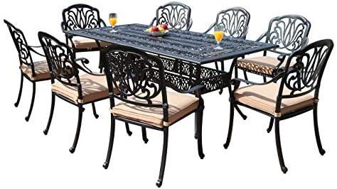The outdoor dining set features a sturdy cast aluminum construction, making it not only durable but also resistant to rust and moisture. This ensures a longer lifespan, even in the face of adverse weather conditions. The set includes eight stackable arm chairs, allowing for convenient storage when they’re not in use, and provides ample seating for family and guests during gatherings. Moreover, the elegant design and intricate patterns add a touch of sophistication to any patio or garden.