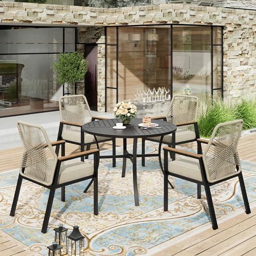 This patio dining set features a robust design with a 42″ round metal table and four woven rattan chairs, ensuring comfort and style for outdoor dining. The chairs are cushioned and made from premium rattan, providing excellent support with an impressive weight capacity of 300 lbs each. The slatted table top allows for efficient water drainage, preventing any water accumulation during rainfall, making it practical for all-season use. Additionally, the E-coating and powder-coating techniques protect against rust and wear, enhancing durability.