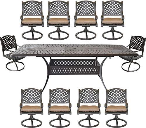 The ultimate solution for outdoor dining, this versatile set features an expansion table that can comfortably accommodate up to ten people. With an extendable design, the tabletop measures between 84 inches and a generous 132 inches, and its two 24-inch leaves can be effortlessly folded and stored under the table when not in use. Each chair in this collection is a swivel rocker, providing comfort and ease of movement—ideal for social gatherings under the sun. Built with durable cast aluminum, this set promises not only style but also weather resistance, making it an excellent choice for a variety of climates.