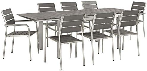 Experience the perfect blend of durability and style with a contemporary outdoor dining set that transforms any space into an inviting gathering area. Constructed from anodized brushed aluminum, it combines weather-resistant features with elegant design elements, including wood grain plastic paneling that gives the tabletop a chic and minimalist look. The extendable table can accommodate up to eight people, making it an ideal choice for family dinners or entertaining guests. Its streamlined silhouette and neutral color palette allow it to seamlessly integrate into any outdoor setting, enhancing the aesthetic appeal of your patio or backyard.