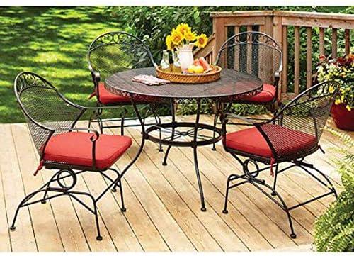 This 5-piece patio dining collection features a sturdy wrought iron table and four comfortable chairs adorned with vibrant red cushions. The set showcases a traditional design that elevates any outdoor space, ideal for hosting diners or enjoying an afternoon coffee. Built with high-quality alloy steel, it promises durability while resisting the elements. The rectangular table, measuring 24 inches in depth, provides ample space for meals, drinks, and gatherings, making it versatile for various outdoor settings.