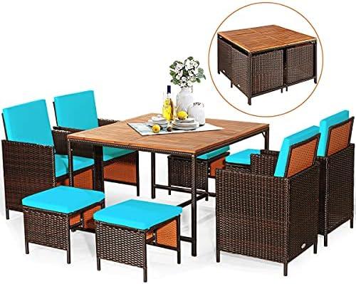 This 9-piece patio dining arrangement features a sturdy dining table paired with comfortable chairs and versatile ottomans, making it perfect for family gatherings or friendly get-togethers. The wide sitting area and ergonomic design of the chairs enable relaxation, while the 43.5″ acacia wood tabletop provides ample space for meals and drinks. It also includes an umbrella hole, allowing for convenient sunshade during hot days. The hand-woven PE rattan coupled with a durable metal frame ensures that this dining set will withstand various outdoor conditions while offering aesthetic appeal.