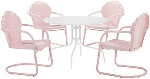 The dining set offers a delightful blend of nostalgia and modern functionality, perfect for those looking to brighten up their outdoor space. With four scalloped chairs encircling a simple yet stylish metal table, this arrangement encourages an inviting atmosphere for family gatherings or casual brunches with friends. The weather-resistant powder-coated finish ensures durability, making it suitable for various seasonal weather conditions, while the UV and rust-resistant features guarantee longevity and less maintenance. The cantilever base of the chairs adds to both the aesthetic and comfort, providing just the right amount of flex for lounge-style seating.