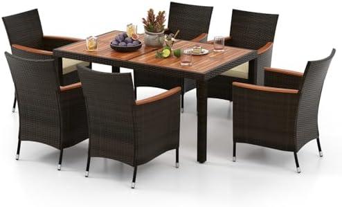 The dining set features a harmonious blend of poly rattan and natural acacia wood, enhancing the aesthetic appeal of any outdoor space, whether it’s a garden, balcony, or patio. With a large table measuring 59″x36″, it provides ample room for family meals or gatherings, complemented by six ergonomic chairs designed for comfort and stability. The waterproof cushion covers ensure easy maintenance, while the adjustable non-slip feet on the table and chairs allow for secure placement on uneven surfaces. It’s not just a functional piece of furniture; it adds a touch of elegance to your environment.