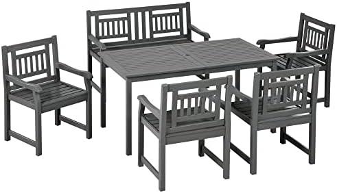 Elevate your outdoor gatherings with this beautifully designed patio dining arrangement, perfect for meals, drinks, or games. The umbrella hole at the center provides shade on sunny days, allowing you to customize your outdoor environment (umbrella not included). Crafted from robust poplar wood, this ensemble promises a sophisticated, upscale appearance, and the high backrest chairs with a cut-out design add a modern touch. The set includes four stylish chairs, a cozy bench, and a spacious dining table, making it suitable for any social occasion. Just make sure to cover the furniture when not in use to maintain its pristine look.