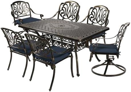 The outdoor dining set features a heavy-duty cast aluminum frame, providing excellent stability against strong winds, making it ideal for prolonged outdoor use. With a round table measuring 47 inches in diameter and six armchairs, it encourages group interaction and is perfect for cozy family gatherings or casual outdoor entertaining. Each chair comes with a 19.96-inch seat width, comfortably accommodating individuals weighing up to 250 pounds. Moreover, the elegant bronze finish adds a touch of sophistication, seamlessly blending with various outdoor aesthetics.