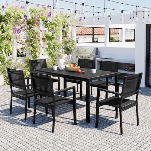 This versatile outdoor dining arrangement comes equipped with six extra-wide foldable chairs and a sleek extendable table, making it an excellent choice for both intimate gatherings and larger parties. The chairs boast a lightweight, powder-coated steel frame for easy portability, while the UV-resistant mesh fabric ensures comfort and durability. The table itself features an elegant wood grain finish, extendable from 63 inches to 94.5 inches, making it perfect for accommodating anywhere from six to ten guests. With no assembly required for the chairs and straightforward instructions for the table, setup is a breeze, allowing you to focus on enjoying your dining experience.