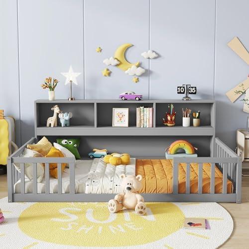 This versatile twin bed offers a ground-level design that allows children to easily get in and out, promoting independence in their daily routines. The guardrails with an opening not only ensure safety by preventing falls but also simplify access. Made from quality pine wood and composite boards, it guarantees durability and stability, making sure your little ones enjoy restful nights. Additionally, the integrated bookcase with distinct compartments serves as an excellent space-saving solution for storing books, toys, and decorative items, reducing the need for extra furniture.