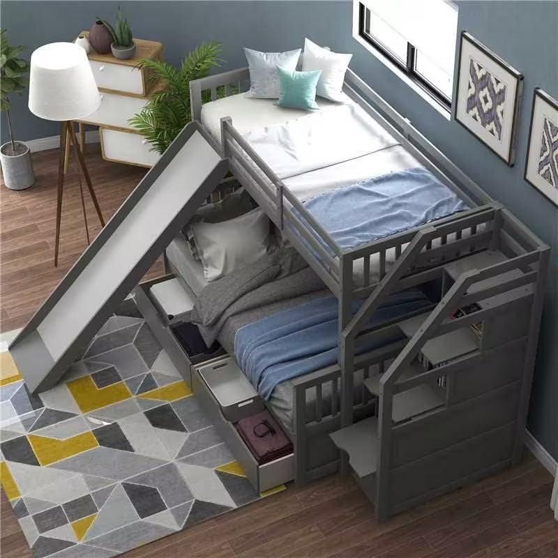 The bunk bed features a twin size top bed and a full size bottom bed, making it ideal for siblings sharing a room. Its solid construction from high-quality pine wood and MDF ensures durability and support, with a weight capacity of up to 400 lbs. The built-in slide adds an element of fun, transforming the bedroom into a playful space, while the convertible stairs provide easy access to the top bunk, allowing placements on either side according to your room layout. Additionally, the storage drawers and compartments cleverly hidden in the stairs offer practicality for organizing bed linens and personal items.
