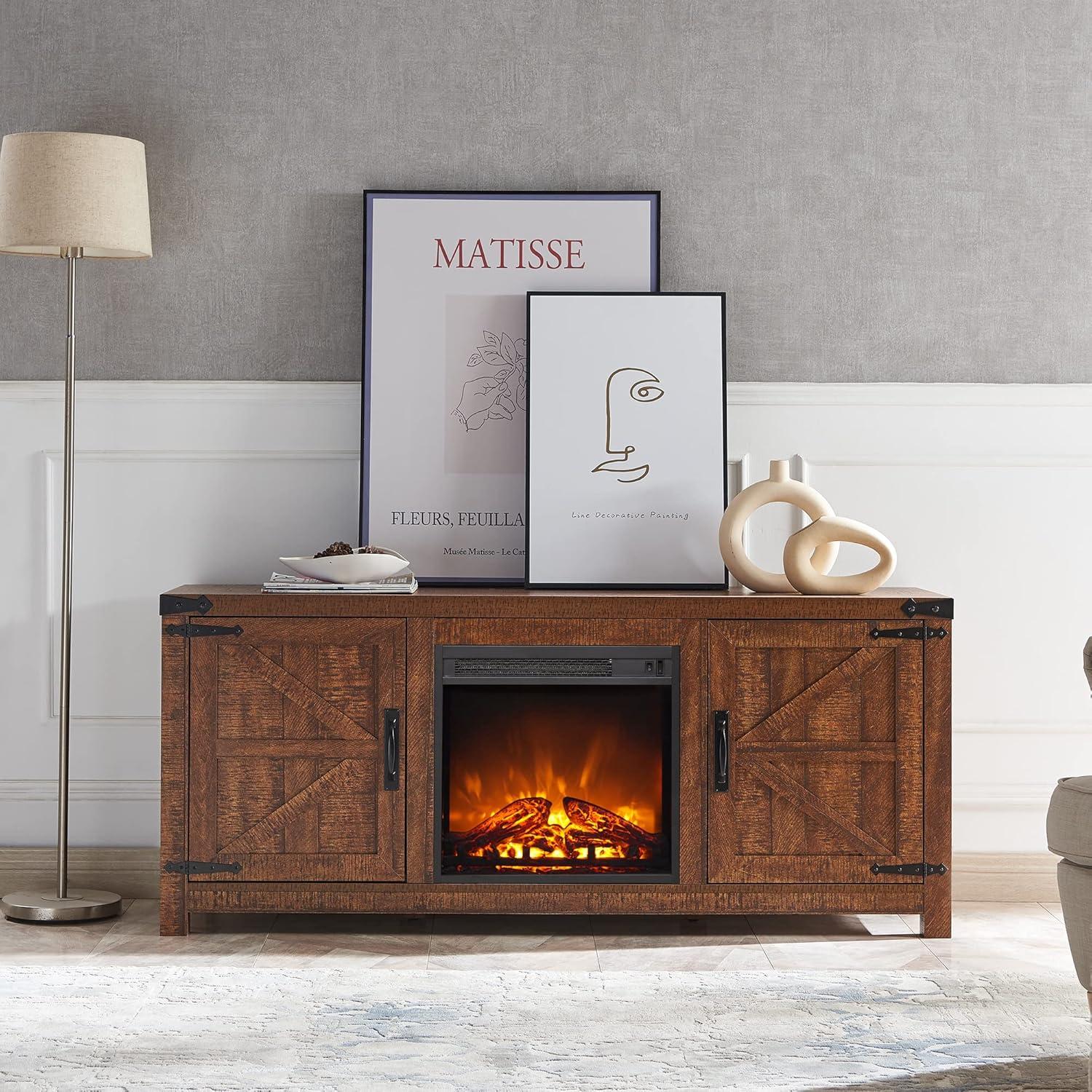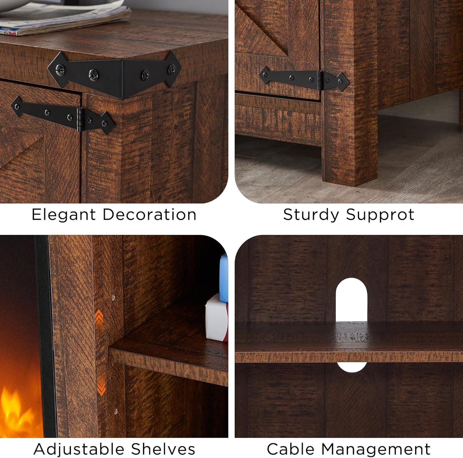 you notice the piece before you switch anything on: a low, wide console whose reclaimed-barnwood finish reads like weathered planks and gives the room an immediate sense of gravity.Up close the texture is slightly rough under your palm, the metal handles cool to the touch, and the barn-door panels slide with a deliberate, slightly noisy thunk.Tucked into the center is an electric firebox; when lit the amber glow softens the grain and the built‑in fan sends a steady warmth you feel in seconds. The T4TREAM fireplace TV Stand sits about the same width as your 65‑inch screen, balancing a broad tabletop with hidden shelving and tidy cord access behind the doors. In the evening its visual weight grounds your seating area—more like a familiar, well-used piece than a showroom prop.