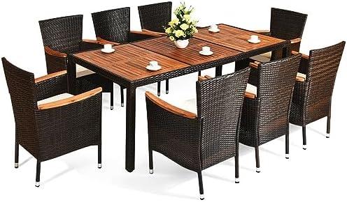 9PCS Patio Rattan Dining Set 8 Stackable Chairs Cushioned Acacia Wood Table Top