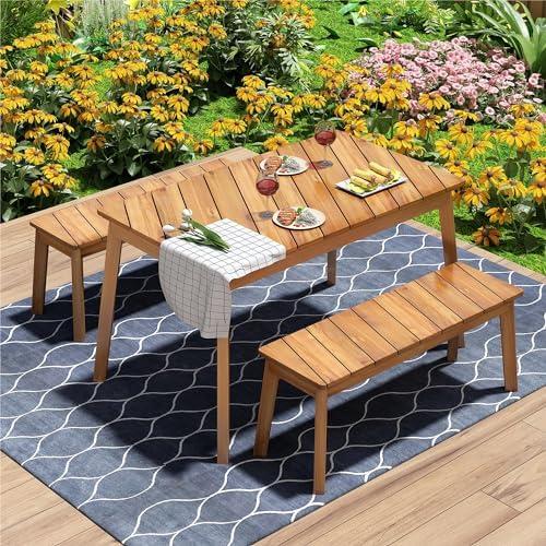 This dining set is designed with a modern flair, featuring unique diagonal grain patterns in the natural Acacia wood, which adds character and warmth to any space. Each piece, whether the table or benches, showcases distinct variations in color and texture, making it truly one-of-a-kind. The set is versatile enough for multiple settings, such as patios, gardens, and indoor dining areas, while also embodying a minimalist aesthetic that complements any decor. With a weight capacity of 250 lbs for the benches and 125 lbs for the table, this furniture promises durability and sturdiness, ensuring a reliable spot for meals with family and friends.