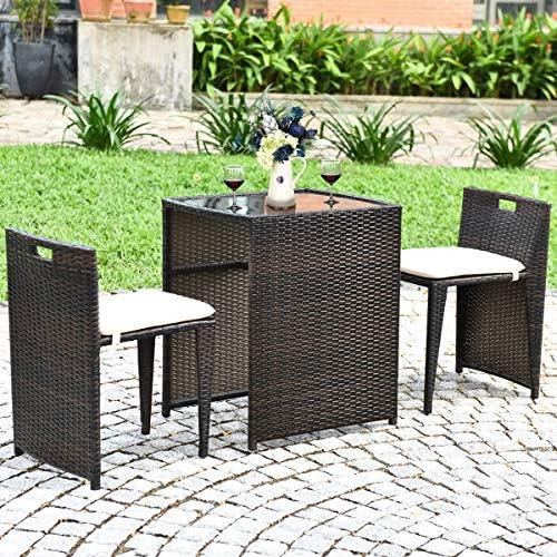This stylish and functional outdoor furniture set features a durable construction combining a sturdy steel frame and premium PE rattan, ensuring longevity even in challenging weather conditions. The lightweight yet robust design includes two cushioned chairs and a tempered glass-top table, allowing for an enjoyable dining experience outdoors on your patio, balcony, or garden. The ergonomic shape of the chairs, complete with soft cushions and backrests, promotes comfortable seating and relieves fatigue during extended use. With a space-saving design that allows the chairs to tuck neatly under the table, this set is perfect for compact spaces or minimalist designs.