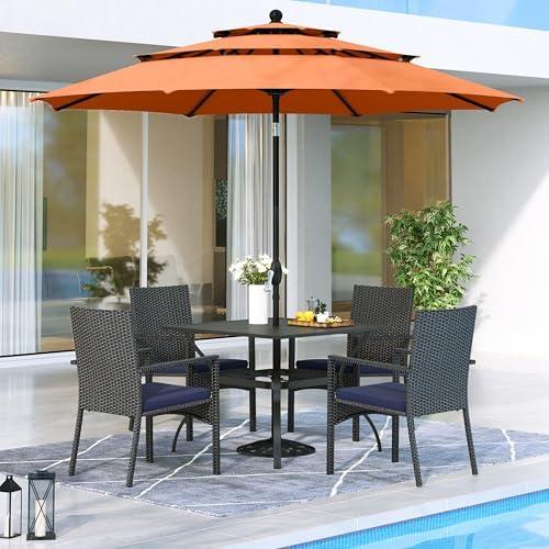 The six-piece outdoor dining set is designed to enhance your patio or backyard experience. Featuring a durable 37” square metal table and four comfortable rattan chairs, this set is not just functional but adds aesthetic appeal with its vibrant orange-red umbrella. A standout feature is the 10ft umbrella, which offers ample shade, perfect for sunny days, ensuring outdoor meals are enjoyable. The robust steel frame and breathable PE rattan construction promise longevity, making it a reliable addition for gatherings.