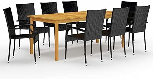 Ideal for transforming your garden or courtyard, this nine-piece outdoor dining arrangement includes eight armchairs designed for stacked convenience, making it easy to store. The large table showcases a striking acacia wood top, coupled with a robust frame constructed from powdered steel and aluminum feet that ensure durability. Its lightweight rattan structure not only eases movement but also simplifies cleaning, making it a practical choice for outdoor dining. The chairs come with plush cushions featuring water-proof covers that are both removable and washable, providing comfort and ease of maintenance for your outdoor gatherings.