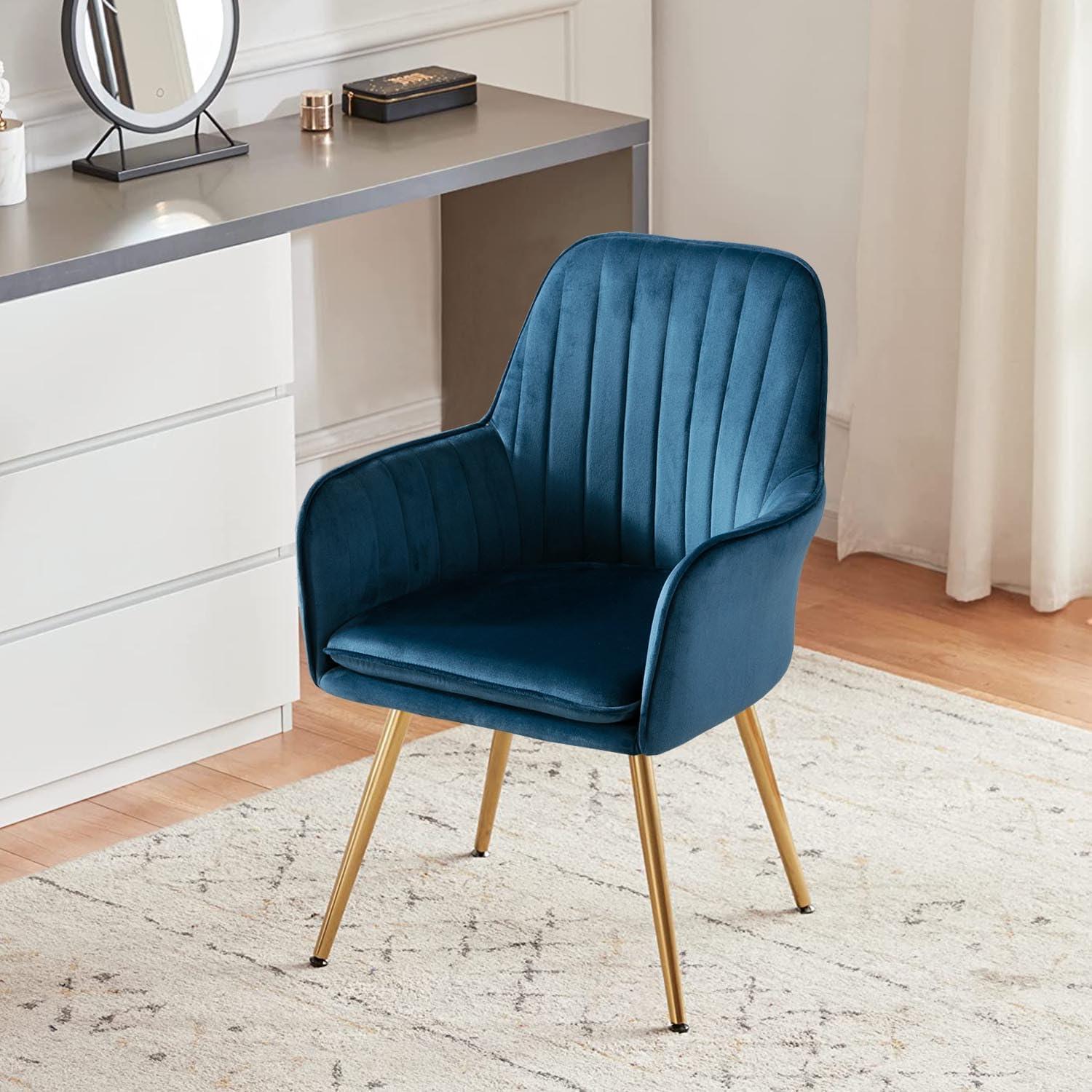 This elegant chair features a stunning blue velvet upholstery that adds a touch of luxury to your space while providing comfort with its high-density foam padding.The ergonomic design and gracefully curved silhouette make it an ideal addition, whether you’re looking to enhance your home office or create a cozy atmosphere in your living room or bedroom.With a maximum weight capacity of 280lbs, it is built with durability in mind, boasting a robust metal frame complemented by sturdy, golden-finished tube legs that give it a modern flair. The adjustable floor protectors ensure stability on various surfaces, making it a practical choice for any setting.